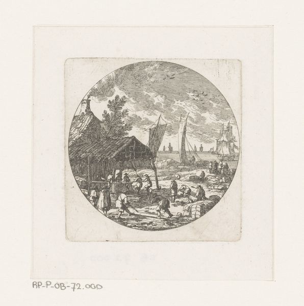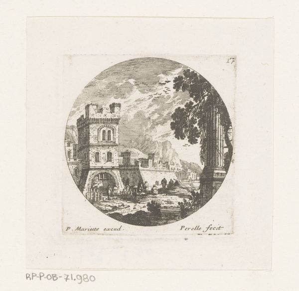 Editor: So, this is Nicolas Perelle's "Gezicht op bouwwerken, torens en brug," or "View of buildings, towers and a bridge," an etching from between 1613 and 1695. It's got this fantastic, almost dreamlike quality... a cityscape contained within a circle. What do you see in this piece that speaks to its time? Curator: The controlled precision of the etching medium is interesting. How does the ordered, constructed world it presents contrast with the turbulent social and political landscape of the 17th century? Consider the Fronde in France, a series of revolts against royal authority, which overlaps with the possible creation date of this print. Do you see echoes of those tensions here, perhaps a longing for stability? Editor: That's a great point! I was initially focused on the aesthetic beauty, the skill involved, but hadn't considered the social upheaval happening at the same time. The architecture does seem idealized, almost removed from reality. Is that common for cityscapes of this period? Curator: Often, yes. These kinds of idealized views served specific ideological functions. They projected power, stability, and a sense of civic pride. Notice how the bridge connects different parts of the city? Bridges often symbolize connection, literally and metaphorically. Consider who has access to those connections, and who is excluded? This raises questions about urban planning, access, and social control that are pertinent even today. What stories does it obscure? Editor: It's like a form of propaganda, subtly reinforcing the established order! I hadn't thought of it in terms of exclusion, more about the visual representation. That shifts my perspective. Curator: Exactly! Art doesn't exist in a vacuum. Examining these historical and social forces helps us unravel the layered meanings embedded in the image. Now, considering this context, how does that impact your initial reaction to its dreamlike quality? Editor: It makes it seem more deliberate, almost strategic. The "dream" becomes a constructed ideal. Thank you; that helps me contextualize so many elements I observed! Curator: And by recognizing this, you start to unravel its ideological complexities. That's what truly enriches our understanding.