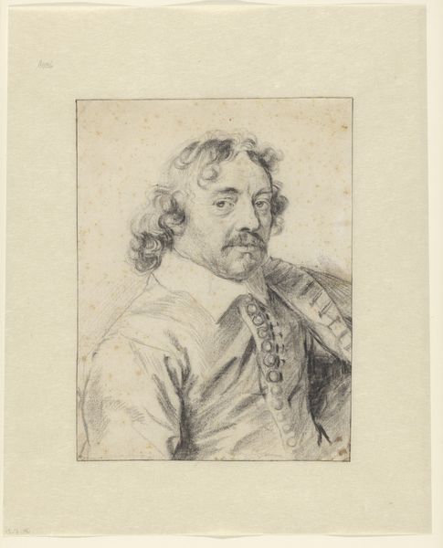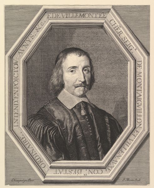Here is an ink wash drawing of Jean Le Mercier, currently residing in the Art Institute of Chicago. The first impression is one of monochrome formality, where shades of gray define the contours and textures of the subject's face and attire. The oval frame provides a rigid structure to the composition. Within this constraint, observe how the artist uses delicate washes of ink to model form and suggest depth. The subject emerges from the pale background through careful gradations of tone. This portrait invites analysis through a semiotic lens: each stroke and shade functions as a sign. Note how the artist used light and shadow to articulate Le Mercier's features, conveying character and status through subtle tonal shifts and the direction of his gaze. The play of light and shadow invites us to reflect on how identity is constructed through representation. This drawing presents a dialogue between artistic technique and social representation, echoing questions about how we perceive and interpret the world around us.