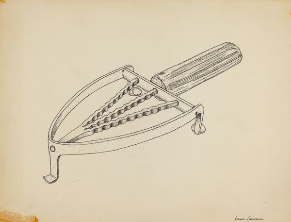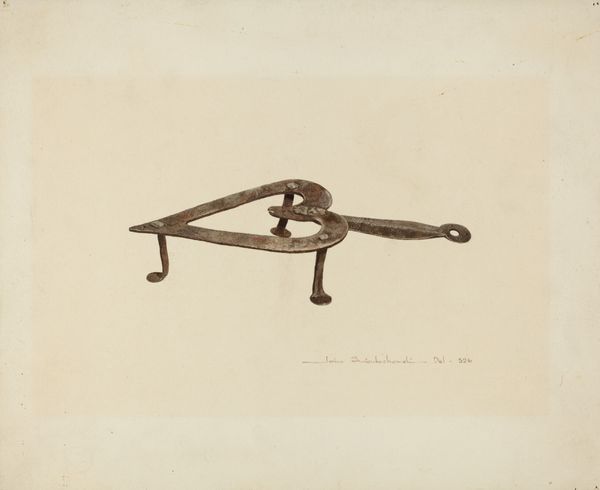 Here we have Salvatore Borrazzo’s drawing of a trivet made with graphite on paper. Borrazzo was active during the first half of the 20th century when there was a renewed interest in early American crafts and design. What does it mean to consider this metal object through the medium of graphite on paper? While the trivet has a clear functional identity, the drawing of it renders it something else entirely. There is the identity of the object itself, a common household item, but also of those who would have used it. Borrazzo himself was part of the Index of American Design, a program of the Works Progress Administration, which employed artists to record examples of American material culture. The drawing asks us to consider the object and its place within a broader narrative of American identity, labor, and economic hardship. The simple beauty and careful craftmanship asks us to consider the labor necessary for its creation.