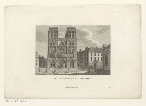 Editor: This engraving, "Gezicht op de Kathedraal van Orléans," dating back to 1818 and created by François Louis Couché, strikes me as so orderly. The architecture feels… well, almost oppressively symmetrical. What details stand out to you? Curator: Oppressive? That's an interesting take. Perhaps that rigidity speaks to the prevailing Neoclassical ideals of the time—a world yearning for order after revolutionary chaos. I’m drawn to the delicate hatching and cross-hatching. See how Couché coaxes light and shadow from simple lines, giving such a stoic building a rather atmospheric, dare I say, ghostly quality? Doesn't it feel as though the cathedral is both present and a memory? Editor: A ghostly memory... that’s beautifully put! I was so focused on the precise lines that I missed that entirely. Curator: Exactly! And look at the people dotted around the base. They emphasize the cathedral's scale but are also, let’s be honest, rather generic, aren’t they? Do they appear particularly thrilled to be in the presence of such a magnificent structure? One wonders. It adds a touch of everyday life, grounding the grandeur in a quiet, almost detached, sort of way. Editor: I see what you mean. It’s less a celebration and more… just there. Part of the city. Maybe that was Couché’s intention— to document, not to deify. Curator: Precisely! Or maybe he just had a lunch appointment to keep. These engravers worked hard, you know! Still, looking closely helps us read those silences, to appreciate that peculiar and perfect dance between grand architecture and the mundane human experience. What a building says, and what we project onto it, always informs how we experience that space in the present day. Editor: So true! I never would have thought of the people in this engraving as… ambivalent! Thanks for offering a fresh way of thinking about this.