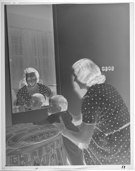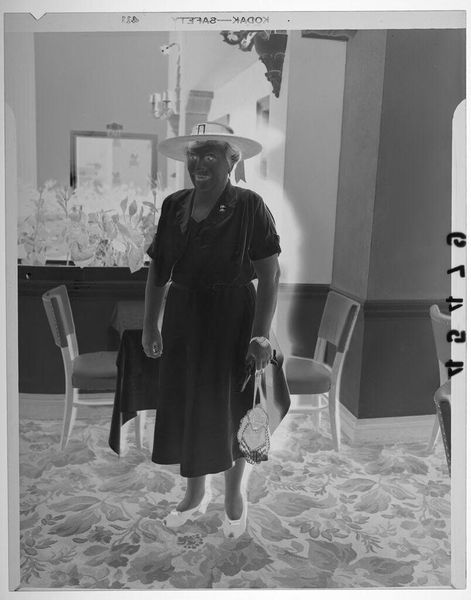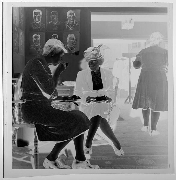 Editor: So, this is a small, intriguing photograph by Jack Gould, simply called "Untitled (door to door salesman with electrolux)." It feels almost like a reversed memory, a ghostly encounter. What leaps out at you? Curator: Isn't it fascinating? To me, it whispers of mid-century American dreams, the promise of technology right at your doorstep. The salesman, almost a caricature, peddling hope in the form of a vacuum cleaner. Editor: I see what you mean. There's a palpable sense of expectation, maybe even a hint of skepticism in the woman's expression. Does that resonate with you? Curator: Absolutely. It makes me think about the theater of everyday life, the roles we play. The light is so odd, like a dream, it obscures what is true. The Electrolux is almost like a divine object. What is the significance of that? Editor: I hadn't thought of it that way, but I guess it was the item that was going to make life better, in a weird way. Curator: Exactly. And the photograph, in its ghostly way, reminds us that those promises are always a bit elusive, don't you think?
