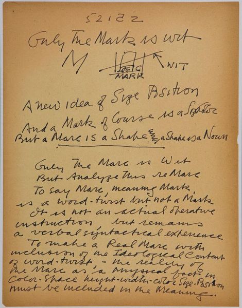 Curator: This intriguing piece is called "Art Theory Text with Star" by Stuart Davis. Editor: It feels like a peek into the artist's mind, like a page torn from a personal notebook. The script is raw. Curator: Exactly. Davis is known for his abstract works, and this text, combined with the small geometric drawing, offers insight into his process, his dedication to finding the unit color, and visualizing elements. Editor: I notice the emphasis on the materials, the white, black, and color itself, it's like he’s breaking down painting to its most fundamental components to reconstruct them anew. The labor is right there on the page. Curator: The handwritten element adds a human touch to what could be seen as a very scientific or mathematical approach to art. Editor: Right. And it's a reminder that even the most abstract ideas are rooted in tangible actions, decisions, and materiality. Curator: A poetic dance between thought and tangible form. Editor: A perfect summary.