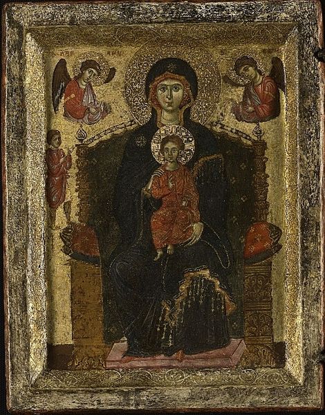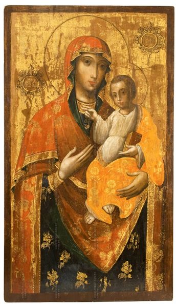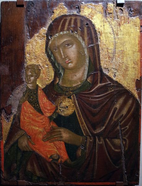 Curator: We're looking at "The Virgin and Child," a tempera on wood painting dating back to between 1305 and 1320, created by the Master from Citta di Castello. Editor: It strikes me immediately with its austerity, its gravity. The gold background lends it a sort of ethereal glow, but there's a distinct lack of sentimentality in the faces. Almost…iconic, but without warmth. Curator: Indeed. Tempera demanded precision; the application of pigment, usually egg-based, required meticulous layering. This process emphasizes form over painterly expression; what might appear to us now as stiffness was in part a consequence of technique. Consider also that these materials—gold leaf, precious pigments—weren't simply aesthetic choices but declarations of value, of labor, reflecting the commission's financial and devotional investment. Editor: Right, the cost must have been substantial. And the way the gold leaf has aged and cracked almost adds to the emotional weight somehow, like the passing of centuries etching themselves onto faith. The way the faces of the virgin and child aren’t soft or traditionally beautiful actually gives me a lot more to think about than a saccharine renaissance image, you know? I keep looking at it... It's more affecting than appealing. Curator: The use of such valuable materials was undoubtedly related to the status of the church for which the painting was created. In regards to the stiffness you notice, there are social reasons that also affected the means of production. Medieval workshops emphasized standardized depictions. Individual creativity wasn't the primary goal, more the execution of accepted forms, serving to visually solidify doctrine. Editor: I like that— solidify doctrine. I’d always attributed a certain feelinglessness of the faces with… just a less sensitive style, I suppose? But I never took it in such a socioeconomic context, or rather how closely connected faith was to a collective economic landscape. So it almost feels… incorrect, right, to seek personal expressiveness as we understand it, in a piece meant to serve community. Curator: Exactly, shifting the question to what purpose the piece of art was produced, for which demographic and to be presented for whom will drastically shift how one approaches analysis of art like this one. Editor: This was more beautiful, thoughtful, and even spiritual, I believe. It makes me feel so at peace now and appreciate even more art, craft, and the business surrounding this time.