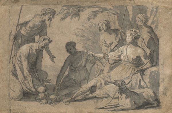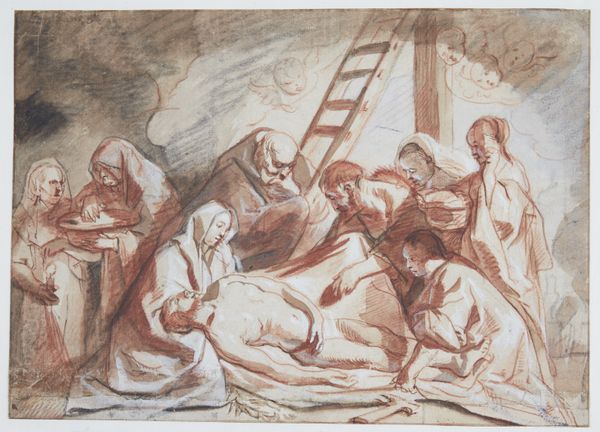 Jacob Jordaens created this drawing, "The Washing and Anointing of the Body of Christ," using pen and brown ink with wash. The composition is immediately striking; a cluster of figures surrounds the body of Christ, creating a dense, almost claustrophobic space. Jordaens uses a limited palette, primarily brown ink, to evoke a somber mood. The texture achieved through the wash technique gives a tactile quality to the scene. The figures are arranged in a semi-circle, directing our gaze towards the pale, recumbent body of Christ, which forms the focal point. Jordaens' use of line and shading creates a sense of depth and volume, particularly in the drapery and musculature of Christ. The ladder and subtle cherubic forms hint at the divine, while the earth-toned palette roots the scene in a tangible reality. The structure of the composition encourages a reading of the piece that transcends its immediate religious subject matter, prompting reflection on mortality, sacrifice, and the human condition.