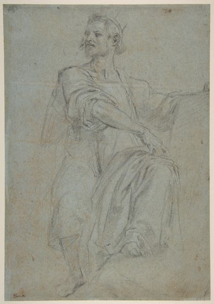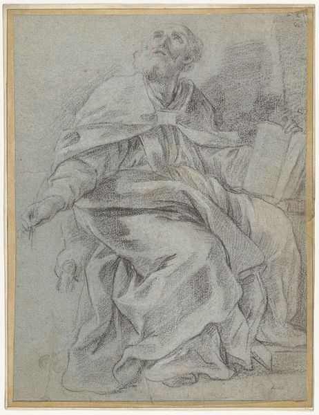 Giacomo Zoboli created this drawing, Study for the Figure of Christ, using black chalk on paper. Zoboli was working in the late Baroque period, a time when the Catholic Church used art to inspire religious devotion. The image captures Christ in a moment of contemplation or sorrow. His downcast eyes and the way he's drawing his cloak around himself could reflect a deep sense of personal burden. During the Baroque era, artists often aimed to evoke strong emotions in viewers, encouraging them to connect with the suffering of Christ on a personal level. The representation of Christ here, with his flowing hair and simple robes, speaks to a specific cultural interpretation of holiness. Consider the power that such images held and continue to hold, shaping perceptions of divinity and morality. Notice the humanity of the figure, an approach that invites empathy and introspection, even today.