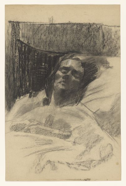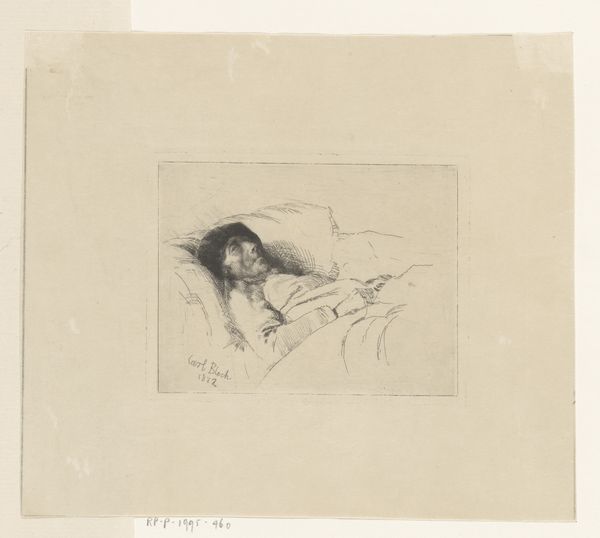 Auguste Danse created this etching of an unknown man on his deathbed, possibly Van Volxem. This image, made in the late 19th century, exists within a cultural context where death was more present in daily life. Danse’s portrayal departs from traditional, heroic depictions of death. Instead, we see a raw, intimate moment, inviting contemplation on mortality. The identity of the deceased being uncertain allows the image to become universal, representing not just an individual death, but death itself. The soft, gentle lines of the etching, which appear almost blurred, evoke a dreamlike quality. This technique, combined with the subject matter, creates an emotional atmosphere, allowing the viewer to meditate on the fragility of life. This artwork encourages us to confront our feelings around loss and grief, and underscores the shared human experience of mortality.