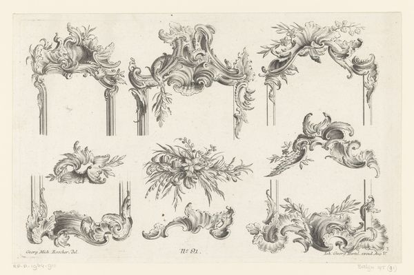 Curator: This is a pen and ink drawing titled "Rocailles," made by Georg Leopold Hertel between 1750 and 1775. It is currently held in the collection of the Rijksmuseum. Editor: At first glance, there's a certain airy lightness to the arrangement. They seem to float on the page like architectural daydreams. Curator: Exactly. "Rocaille" refers to a specific kind of ornamentation popular in the Rococo era. Consider the process here. These aren't just abstract shapes; each flourish is meticulously planned, likely intended to be translated into plaster or wood by artisans. The drawing becomes a template, a set of instructions embedded with cultural significance. Editor: I see it also speaking to class and power, how ornament and decorative arts serve a purpose beyond aesthetics. These are signifiers of luxury and status during a period of massive social upheaval, a form of propaganda through display, a tool for distinguishing aristocracy from commoners. How was labor valued or devalued? What systems enabled this type of patronage and artistic production? Curator: A sharp point. Think too, about how this challenges the very notion of authorship. Hertel isn't necessarily crafting a unique 'art object' in the modern sense, but rather generating reproducible designs intended for practical use. His skill lies in visualizing these three-dimensional forms on paper. The materials, the ink, and pen, the paper itself – the raw components of artistic creation – all facilitate his, and other's labor. Editor: It also makes me think about women's labor in particular, often overlooked. Ornamentation like this frequently found its way into embroidery, textiles, or even detailed lacework. This was labor relegated as 'craft', its value undermined. It provokes us to think how patterns of inequality persist. Curator: Indeed, the Rococo style itself, despite its reputation for frivolity, relied on very serious craft practices. The drawings such as this highlight an intricate network of designers, artisans, and patrons all interwoven, a network from which certain people are excluded. Editor: Analyzing “Rocailles,” helps to deconstruct and unveil dynamics of gender and socio-economic privilege, allowing to situate this piece in larger conversations that reveal hierarchies embedded within materials. Curator: By observing Hertel’s technical expertise and these ornamental components, we're granted a greater understanding and insight into the aesthetic preferences and cultural norms of the 18th century. Editor: Right, and this also provides an entryway into comprehending these power systems at play, both back then and now.