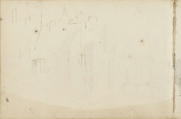 Curator: This is John Singer Sargent's pencil sketch, "Molding Profiles, Squared; verso: Designs for Ornamental Ceiling Panels," held at the Harvard Art Museums. Editor: My first impression is that it is skeletal—raw intention laid bare. The inscription “too broad” gives it a wonderful aura of candor. Curator: Yes, it reveals a work in progress, a glimpse into the artistic process. We often see Sargent as this confident portraitist, but here we see him wrestling with design elements. What cultural associations arise for you? Editor: Well, the ceiling panel designs, however minimal, evoke a lineage of architectural ornamentation, speaking to wealth and power structures, especially in the Gilded Age context. Curator: Definitely. And consider the symbolic weight of ceilings themselves—they represent aspiration, the heavens, the realm of ideas. His design choices must align with the psychological effect he aims to create. Editor: Seeing this more utilitarian side of Sargent really humanizes him. It shows the foundations upon which his more celebrated works are built. Curator: Absolutely. It shifts our focus from the grand masterpiece to the essential groundwork, which, for me, adds another layer of depth to his overall body of work.