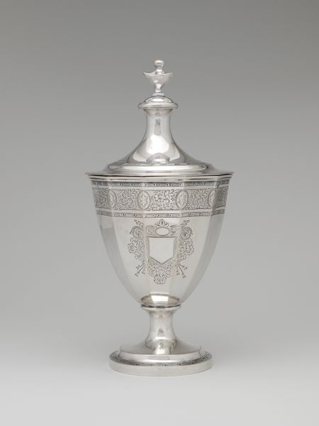 Editor: So, here we have a fascinating silver goblet, crafted in 1686 by Thijmen van Leeuwen. It’s actually called 'Beker van het kapittel van St. Marie te Utrecht,' which doesn’t exactly roll off the tongue! The baroque style gives it this really ornate feel... almost over-the-top, you know? But in a good way! What do you see when you look at it? Curator: Ah, yes, over-the-top is Baroque in a nutshell, isn’t it? What strikes me is that this isn't just a drinking vessel, it’s a statement. Can you imagine holding it? It feels like a relic. There’s a kind of...whispering history about it, the stories of Utrecht held within. Notice the inscription around the top and those vignettes all over the body? Do you wonder who they depict or what their narrative might be? It makes me feel like I've unearthed something profound, even mystical, though the weight, heft, and coldness of the metal remind us of time's persistent power. Editor: I hadn’t really thought about those scenes as telling a specific story. I just assumed it was decoration. Are they common stories? Biblical perhaps? Curator: They very well could be rooted in local folklore, emblems of the chapter’s history or the city’s triumphs, possibly a touch of civic pride stirred in for good measure! We would have to delve into the chapter's chronicles to discover precisely which characters are featured. Even if the characters might be specific to this local place, how does that change your perspective? Editor: Well, that makes it even cooler, actually. To think that this ornate, shiny goblet is telling the tale of a specific place... I guess that makes it super unique. Curator: Precisely! It moves beyond decoration into active storytelling. Now it is your turn. If you owned it what space of your house would benefit the most of it? The dinning room, the chimney mantle, a bookcase... Editor: Definitely not hidden away! Somewhere I could show it off. Somewhere that deserves this touch of extravagance, maybe a display case. It's too beautiful not to be seen and admired. I’ll have to rearrange the space now in my mind… Curator: Then you're a convert! From decorative art admirer to thinking like a collector. Fantastic!