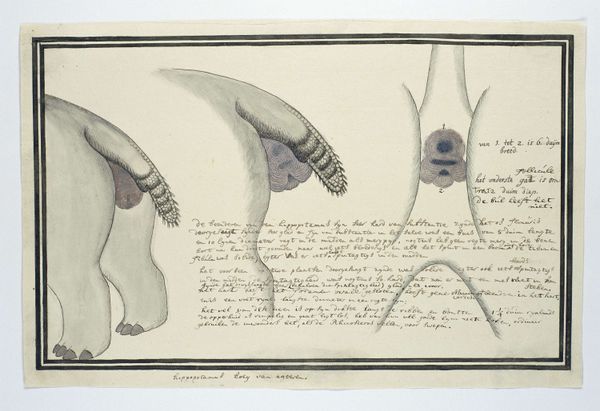 Editor: This is an anonymous work, "Fanciful Depiction of a Cicada," likely created between 1862 and 1900, using drawing, colored pencil, and print techniques. The exaggerated features and the stiffness in the posture give it a satirical, almost cartoonish feel. How do you interpret this work? Curator: Well, what strikes me immediately is how this seemingly innocent depiction speaks volumes about power dynamics in scientific illustration and beyond. Naturalism, the listed style, promised objectivity, but even here, the artist's hand and biases are evident. Consider how scientific illustrations of this era often mirrored colonial agendas, categorizing and “owning” the natural world. Editor: That's an interesting point. So you're saying even a cicada drawing might participate in a bigger conversation about colonialism? Curator: Precisely! The "fanciful" element, as the title suggests, could be a commentary on the very act of imposing human interpretation on nature. Is this accurate depiction or exaggerated caricature? This tension questions the supposed neutrality of scientific observation itself, potentially offering resistance against purely exploitative views of the environment. The artist makes visible a very active manipulation. Do you see the inscription, the script-like prose there at the side? Editor: Yes, it is in the lower right of the work. Is it legible? Curator: That text needs further study. But how can that support the idea of a social commentary? Editor: It looks like this cicada is more than just a bug; it's a lens through which we can examine social and political structures. Thank you. Curator: Exactly, by playfully disrupting our expectations, the work invites us to consider how even the most objective-seeming representations can be deeply implicated in broader power structures. There is much more work to be done on understanding that text.