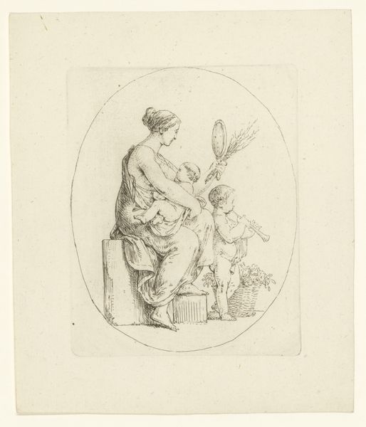 Christian Bernhard Rode created this allegory of medicine as an etching sometime in the 18th century. The print depicts a female figure, possibly Hygieia, the Greek goddess of health, attending to a young boy. A snake, often associated with healing and medicine, coils around her arm. Made in Germany during the Enlightenment, this work reflects the period's growing interest in science and rational approaches to health. The style recalls classical imagery, aligning medicine with the authority of ancient knowledge. Prints like these were often used in educational settings, instructing future doctors and promoting new ideas to the public. They also shaped perceptions of medicine as a noble and learned profession. To understand this image fully, one could research the history of medical education in 18th-century Germany, as well as study the rise of scientific societies and the visual language used to promote new ideas about health and the human body. The meaning of this art is tied to its social and institutional context.