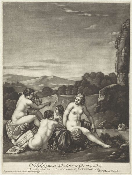 Pieter Schenk created this print, "Bathing Nymphs," around the turn of the 18th century, using an intaglio process. The image began as a polished copper plate. Schenk would have used a sharp tool called a burin to incise lines into the metal. These lines hold the ink. Then, the surface of the plate is wiped clean, and the printmaker presses paper against the plate with considerable force, transferring the ink. The result is a mirror image of the original design, with a slightly raised texture. Look closely, and you can see how the varying density of lines creates a full range of tones, giving form to the figures and depth to the landscape. Printmaking like this demanded technical skill, patience, and close attention to detail, labor that Schenk, as a tradesman, sold on the market. Considering the broader context, this print exists because of the increasing commercialization of art at this time. It demonstrates the way that luxury goods were becoming available to a wider audience, not just an elite. So, next time you see a print, think about the many hands involved in its production, and its role in shaping visual culture as we know it.