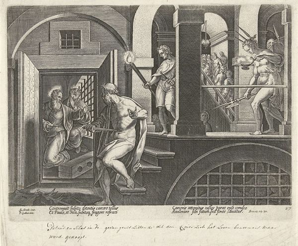 Philips Galle made this print, "Fillippus wordt door een engel naar een eunuch gestuurd," which translates to "Phillip is sent by an angel to a eunuch," sometime between 1587 and 1612. The image represents a biblical scene from the Acts of the Apostles. Galle was based in the Netherlands during a period of religious and political upheaval. The Dutch Revolt against Spanish rule was ongoing, and religious tensions between Catholics and Protestants were high. Prints like this one served a crucial role in disseminating religious ideas during the Reformation. The print’s composition and style reflect the artistic conventions of the time, blending Northern European realism with Italian Renaissance influences. Galle worked for the Plantin-Moretus publishing house, which produced a wide range of books and prints. Examining the archives of this and other institutions provides further insights into the social and cultural context surrounding Galle’s work and the role of art in shaping religious and political discourse.