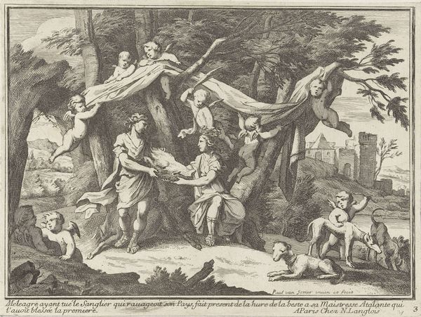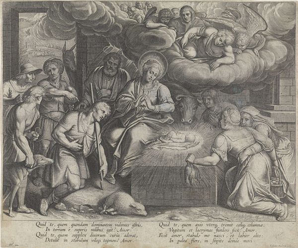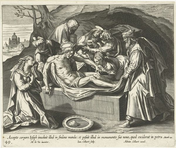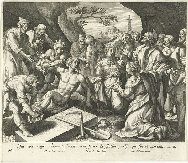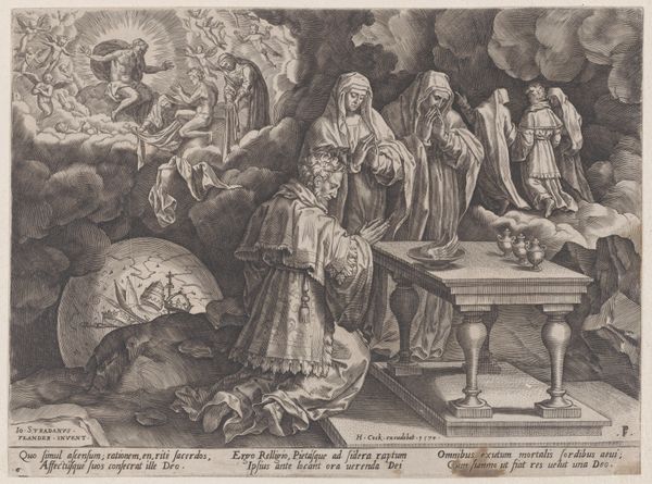 Cornelis Galle I made this engraving, "Christus in de hof van olijven," which translates to "Christ in the Garden of Olives," sometime between the late 16th and mid-17th centuries. The image illustrates a moment from the New Testament, capturing Christ's anguish and his disciples' slumber before his arrest. Galle was based in Antwerp, a city in the Spanish Netherlands that served as a major center for artistic production and dissemination. Galle's work reflects the dominant Counter-Reformation culture of the period. The Catholic Church strongly influenced artistic output, often commissioning works that reinforced religious doctrine and moral values. Galle's detailed engraving would have been easily reproducible, and thus able to communicate and reinforce orthodox religious beliefs to a wide audience. Historical investigation of the image and the artist sheds light on the role of art in shaping religious and cultural identities. Studying sources from the period helps us understand the institutional and social forces that shaped this artwork and its reception.