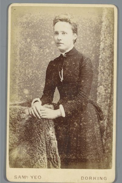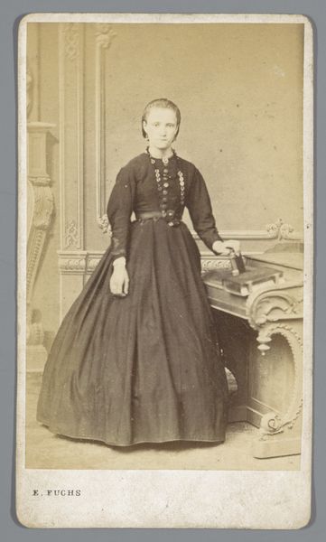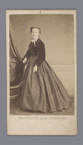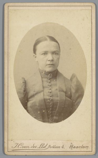 Curator: This is "Portret van een onbekende vrouw," or "Portrait of an Unknown Woman," by Louis Robert Werner, dating from between 1871 and 1877. Editor: My first impression is one of subdued constraint; the limited tonal range emphasizes a certain somber quality in the subject’s posture and expression. Curator: The sepia tones and somewhat stiff pose certainly evoke that, don’t they? Consider how the artist employs line; note the precision in rendering the ruffles of her dress against the smooth fabric. It creates a powerful tension. Editor: And let’s think about that dress! Its very structure – tightly buttoned, high-necked – speaks to the restrictive roles imposed upon women of that era. This portrait could be interpreted as a quiet act of resistance, or at least a muted expression of individuality. Curator: I can appreciate that interpretation. And looking closely, there's also the very deliberate composition, anchoring the figure firmly within a clearly defined pictorial space. There is symmetry in the subject’s placement, bisecting and grounding the portrait with its precise balance. Editor: Precisely, the image acts as an artefact ripe with stories untold. One might imagine the woman pondering, resisting the gaze that presumes to capture her. We can reclaim it, decentering that dominant viewpoint. Curator: It's fascinating how Werner uses these seemingly simple techniques to achieve such depth. A certain timelessness emerges through the strategic interplay of light and shadow, surface and depth, as the materiality guides the eye. Editor: Right, thinking about the "unknown" nature of the subject allows us, paradoxically, to connect with the historical narrative more acutely, focusing on class and gender constraints within that space and era. The absence of specific identity becomes the focal point, universalising experiences. Curator: Indeed, thank you for shining a light on its enduring capacity to provoke questions and offer new ways of seeing. Editor: My pleasure. A potent visual reminder to look beyond surfaces.