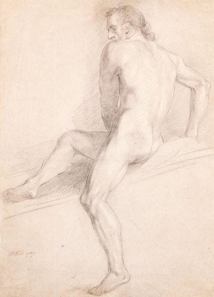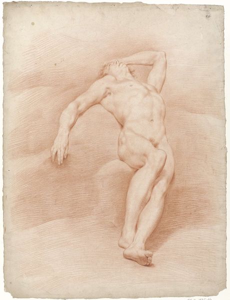 Curator: Here we have "Zittend mannelijk naakt", or "Seated Male Nude," a drawing created by Cornelis Joseph d' Heur sometime between 1717 and 1762. It is done with dry media, likely pencil, on paper. Editor: It feels academic, a study perhaps. The sitter’s pose, the angle of his head—everything seems to point inward, a thoughtful solitude. The reddish tone adds warmth, but there's also a certain melancholy in the downcast gaze. Curator: Yes, the classical contrapposto and the artist's technique reflect academic art practices common during the Baroque era, prioritizing anatomical accuracy and idealized form. But note how the paper itself bears witness to its creation—the material reality of artistic labor made evident. Editor: Indeed. The linear precision in defining muscle and bone strikes me, and the carefully hatched shading evokes a sculptural presence, alluding to depth and volume within a two-dimensional framework. I can almost feel the texture of his skin and the rough surface of whatever he's seated upon. Curator: Consider, also, the social context: this wasn't just about aesthetic pleasure. Nude studies were crucial for artists to master human anatomy, and that proficiency was essential for creating historically and mythologically themed paintings for wealthy patrons, paintings which reinforced prevailing power structures and narratives. The drawing, a functional object and a step in a much broader production chain. Editor: Precisely, and consider d' Heur’s use of color and light! He deftly directs our eyes, structuring the entire composition. His careful build-up of shadows and highlights emphasizes musculature, drawing my attention across the paper. Curator: In that time, even the 'raw' materials spoke volumes, didn’t they? Paper sourced from particular mills, pencils with carefully regulated graphite content… each decision embedded in a matrix of material supply chains, economic power, and cultural preferences. Editor: I see your point. Yet beyond the labor, context, and materiality, I perceive something deeper: the sheer artistic ability and its timeless quality—capturing not only physical form, but also an essential facet of the human condition. Curator: Perhaps that intersection between tangible making and something just beyond our grasp—a meeting point for formal design and lived reality—is precisely what makes such pieces resonate centuries later. Editor: It certainly offers a way to connect with a sensibility distant, but somehow, still so present.