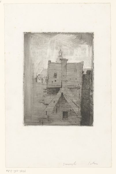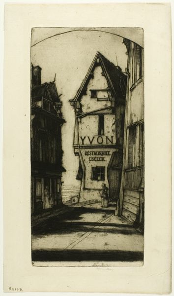 Editor: So, this is "Rue Géricault in Rouen" by Camille Pissarro, created in 1896 using etching and ink. It really evokes a feeling of quiet, almost like a stage set waiting for actors. It’s incredibly detailed for such a small print. What jumps out at you when you look at this? Curator: You know, I love how Pissarro captures the feeling of a specific place. The lines, although etched, almost feel like watercolors in their subtlety, don't they? The etching’s got this hazy, dreamlike quality. Do you think it romanticizes the city or captures its raw essence? Editor: That's a great question! I think it’s a bit of both. There’s a grittiness to the subject, an honesty, but also this soft, gentle light that almost elevates the scene. It's impressionistic in its ability to portray atmosphere over sharp details, isn’t it? Curator: Exactly! He invites us to experience Rouen, not just see it. The crooked buildings lean into each other like gossiping neighbors, creating this intimate, enclosed space. I'm curious; how does that tight composition make you feel? Do you sense any other underlying stories or connections here? Editor: It definitely feels intimate. A little claustrophobic, maybe. But the longer I look, the more I notice, like that little cart tucked away on the side, the slight lean in the houses – it's so wonderfully imperfect. Curator: Yes, isn’t it fantastic how he finds beauty in the mundane? It’s those imperfections that sing to me the most! Ultimately, this print reminds us to slow down, to truly *see* the everyday magic of the places we inhabit. We should try to approach this chaotic world of our own with the spirit of an etcher, making our mistakes into patterns, using it as a mirror in the hope of self-discovery. Editor: I’ve definitely learned a new way to look at cityscapes. Seeing the beauty in the “imperfect” definitely strikes a chord!