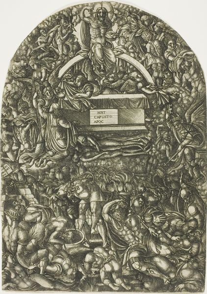 Editor: This is Jean Duvet's "A Star Falls and Makes Hell Open, from the Apocalypse," created sometime between 1480 and 1570, using pen and ink. The density of figures is overwhelming; where do you even begin to interpret such a chaotic scene? Curator: It's chaotic, yes, but a very deliberately constructed chaos, echoing the apocalyptic visions of the Book of Revelation. Consider how Duvet uses light and shadow. The figures emerging from the pit are almost blindly reaching upwards, aren’t they? They seek that divine light, but are trapped by their earthly forms, their sins perhaps. The light emanates from an expectation of hope. Editor: That’s interesting; I hadn’t considered the upward gaze as hopeful, more as… desperate. But, why so many figures? What do they represent? Curator: Ah, the multitude! Each figure is a symbol, embodying humanity in extremis, caught between earthly suffering and divine judgment. Duvet’s Mannerist style allows him to cram them in, a swirling mass of bodies that evokes both terror and a certain, unsettling beauty. Notice how certain symbolic objects, such as the star, become almost lost amongst all these individual expressions. Editor: So, it's not just a depiction of hell opening, but a reflection on humanity's place within that cosmic event? The sheer volume reflecting the scale? Curator: Precisely. And think of the engraving process itself—the laborious carving of each line mirrors the arduous path to salvation. This image wasn’t simply made; it was almost… conjured, like a spell, wasn’t it? To conjure both wonder, and warning. Editor: I can definitely appreciate it more, understanding it in its historical and symbolic context, as something much deeper than literal hell. I was certainly lost within its surface, so thank you! Curator: And I’m refreshed by your youthful consideration! Such artwork becomes a lens, focusing ancient fears and hopes, and revealing facets we can all find in ourselves.