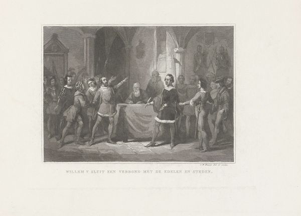 Editor: Here we have "Maurits ontvangt de afgezanten van de sultan van Atjeh, 1602" which translates to "Maurice receives the emissaries of the Sultan of Aceh, 1602," a print made between 1840 and 1884 by Jan Frederik Christiaan Reckleben currently housed at the Rijksmuseum. I am immediately drawn to the contrast in clothing, suggesting different social status and cultural origins. What do you see in this piece, especially given its depiction of a historical meeting? Curator: I'm interested in the materiality of this print. It's an engraving, a reproducible medium, meant for dissemination. This print, made long after the event it depicts, becomes a material record shaping the narrative of Dutch colonial encounters. It tells us less about the "actual" 1602 event and more about how the Dutch *wanted* to remember it in the 19th century. Notice how the engraver meticulously renders the details of clothing - emphasizing Dutch "civilized" garb versus the Sumatran delegation. Consider also how easily printed images circulated; What purpose did these serve in shaping popular opinion or justifying colonial ventures? Editor: That’s interesting. I hadn't thought about it that way. It makes me wonder about the engraver's own social position and biases in producing this image, almost like propaganda in retrospect. Curator: Precisely. The engraver, Reckleben, and the production process itself, become vital subjects for analysis. Were they commissioned? Who consumed these images? What power dynamics are materially embedded within this readily accessible form? By exploring such avenues we challenge traditional notions about artistry and focus instead on the historical, social, and material construction of the work. Editor: I see it now. It’s not just a depiction of a historical event, it's an object loaded with information about Dutch colonial ambitions and how they chose to portray themselves through easily-accessible visual material. Curator: Exactly. Analyzing it through a material lens reveals the power relations embedded within the work’s production, distribution and reception. Editor: Thanks, this has really made me think about historical art in a completely different light. I never thought about prints as more than just copies before. Curator: Indeed. It’s crucial to acknowledge how artistic creation always reflects its surrounding materials and conditions.