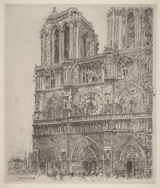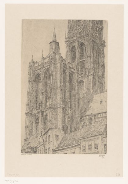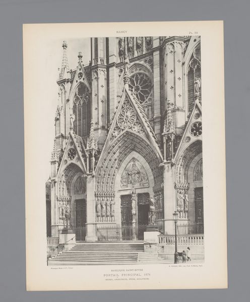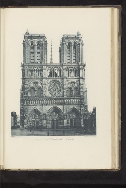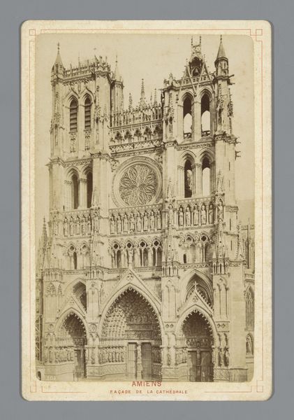 Editor: This is a photograph by Étienne Neurdein, titled "Façade van de kathedraal van Laon," taken around 1895. The aged paper gives it such a delicate, ethereal quality, almost like a dream. What strikes me most is the stark contrast between the immense scale of the cathedral and its almost faded appearance. What do you see in this piece? Curator: What I see here is more than just an architectural study; it's a commentary on power, faith, and the societal structures they uphold. This image, taken at a time of significant social upheaval, captures the enduring presence of the Church, but its faded quality hints at a questioning of its dominance. Look at the way the light renders the stone almost translucent – does this suggest fragility, a challenge to its seemingly impenetrable authority? Editor: That's a fascinating take! I hadn't considered the social context so deeply. I was focused on the aesthetics. Do you think Neurdein was intentionally making a statement? Curator: Intention is always complex to ascertain. However, by documenting this cathedral's facade in this particular way, Neurdein participates in a dialogue about permanence versus impermanence, authority versus skepticism. Photography, then a relatively new medium, itself challenged traditional forms of representation and, by extension, the institutions they often served. The choice to use a sepia tone, reminiscent of older processes, could be read as an engagement with history, inviting viewers to consider the cathedral's place within a changing social and political landscape. How does that influence your reading of the image? Editor: It makes me think about how even seemingly objective documentation like photography can be deeply subjective and tied to broader cultural conversations. I see it now – this isn’t just a pretty picture of an old building. Curator: Exactly! By considering the historical moment and Neurdein’s choices, we gain a richer understanding of this artwork and its potential meanings. Editor: Thank you, I never would have looked at it this way without your input! Curator: And your initial observation about the ethereal quality alerted us to the image’s nuanced effect! A perfect partnership.