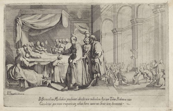 This engraving, made by Leonard Schenk, depicts the death of Christiane Eberhardine von Brandenburg-Bayreuth. Observe how the composition is structured around the dominant horizontal form of the deathbed. The artist employs fine, dense lines to create texture and shadow, conveying the somber mood of the scene. Note how the arrangement of figures, clustered around the bed, draws our eye to the central event. This formal organization invites us to consider the semiotic codes embedded in the image; the bed itself operates as a signifier of mortality, while the surrounding figures, with their gestures of grief, amplify this message. The architectural setting, rendered with precise detail, frames the personal tragedy within a larger social and political context, questioning fixed meanings of power. The artist uses linear perspective to create depth, yet the compressed space also intensifies the emotional impact. Art, here, serves not merely as a representation of death but as an exploration of its cultural and philosophical implications.