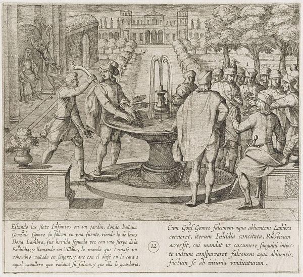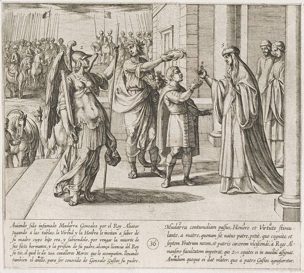Curator: This engraving, by Antonio Tempesta, an Italian artist active in the late 16th and early 17th centuries, depicts "The Letter Orders the Murder of Gonzalo Gustos and the Capture of the Infantes." It's currently held in the Harvard Art Museums collection. Editor: Wow, it's like a stage play frozen in time. All these characters dramatically reacting. There's such tension, you can almost hear the whispers and the clank of those shackles. Curator: Tempesta was known for his detailed and dramatic battle scenes, and here, he employs a similar intensity to depict a scene of political intrigue and betrayal. Editor: I'm drawn to the central figures – the king, so composed, and the figures being taken away. The composition really guides your eye through the story. Curator: Absolutely. The careful use of line and shadow creates a real sense of depth and emphasizes the emotional weight of the scene within its historical context. Editor: Makes you think about how these power plays always end up costing someone everything. Tragic, really.