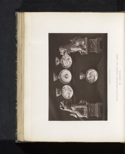 This is a photograph titled 'Chinees porselein', made by Lemercier & Cie. The composition arranges plates and vases against a stark, dark background, emphasizing their form and design. The arrangement is structured yet somewhat playful, as objects are shot in a way that creates a pattern which draws the eye across the surface, prompting a detailed visual inspection. Each piece is presented to highlight its shape, texture, and painted decoration, prompting us to consider how these elements contribute to the object's identity. This photograph functions not merely as a record but as an interpretation, inviting questions about the cultural significance of porcelain and its representation through photography. The contrast of light on the porcelain against the dark backdrop, combined with the ordered placement of each piece, suggests a careful consideration of balance, space, and visual hierarchy.