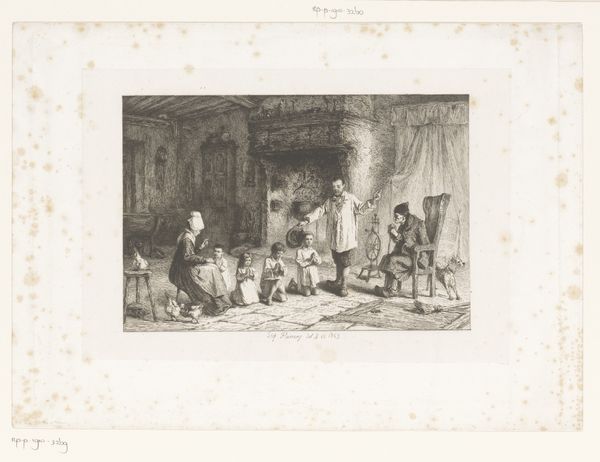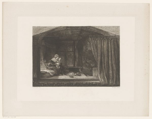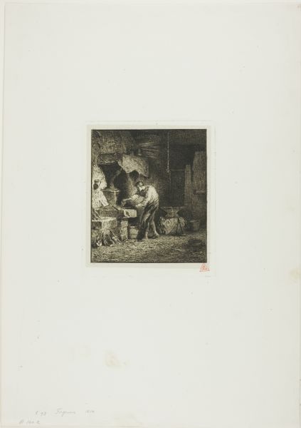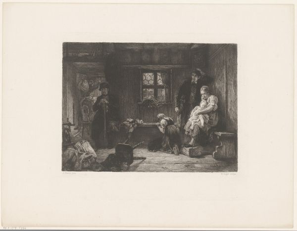 Curator: Here we have Guillaume Joseph Vertommen’s "Company of Five Drinking Warriors by a Hearth," an etching dating back to 1850 and housed right here in the Rijksmuseum. What’s your initial read? Editor: Immediately, it feels…dim. Almost claustrophobic. The figures are gathered so tightly in this space, lit mostly by what I assume is the hearth, it has a certain intimacy to it, or perhaps a weariness, after a long day’s march, no doubt. It feels incredibly…grounded. Curator: That’s astute. Genre scenes like this were very popular in the mid-19th century. Artists were really turning their attention to the everyday lives of ordinary people, which signaled a broader shift in social consciousness, particularly with movements like realism gaining momentum. Art was meant to mirror society, capturing slices of life as they were, or as some hoped to see them represented. Editor: Mirroring society, maybe...but through whose eyes? These 'warriors', cozy with their tankards in their hideaway are probably romanticized versions, don’t you think? But still, I get a feeling of shared stories, that camaraderie built from shared danger or difficulty. You can almost hear their voices, slurred slightly by drink and exhaustion, telling tales both real and exaggerated. Curator: There's undoubtedly an element of romanticism here, shaping a narrative perhaps more palatable for a public keen on heroic imagery and sentimental tales, though Vertommen grounds the scene in realism, which gives it weight, an almost journalistic quality that suggests he is documenting an unadulterated observation, while elevating an historical one. He's inviting the viewer to step inside, not just observe but also partake, engage with these figures, and consider the times they are living in. Editor: Exactly, you’ve got to wonder about their context! Were they mercenaries? National soldiers? Or are they just role-playing, indulging in historical fantasy in a troubled time? And that darkness—it obscures more than it reveals, adding layers of uncertainty that I, as an observer, just can’t shake loose. A certain discomfort rises in the darkness; in this ‘slice of life’ as you call it. Curator: It leaves us, as present-day viewers, wrestling with more complex issues. "Company of Five Drinking Warriors" serves less as a transparent depiction and more as a point of entry into debates about memory, representation, and the shaping of historical and political narratives in art. Editor: And that’s exactly what makes this image stay with you! Cheers to that.