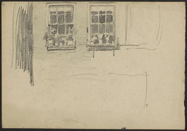 Editor: This etching by Niels Skovgaard, “Children by the Window,” made in 1900, shows three children gazing out at a snowy landscape. The limited color palette creates an austere and slightly melancholic mood. What stands out to you? Curator: Initially, I’m drawn to the artist’s use of line. Notice how the density and direction of etched lines not only define form but also create distinct textural effects. For instance, observe how the coarse, almost scribbled lines of the children’s clothing contrast sharply with the delicate, feathery strokes depicting the winter trees. Editor: So the texture contributes to the overall aesthetic? Curator: Precisely. And consider the window frame. Its rigid geometry sharply bisects the pictorial space, creating a play between the interior world of the children and the exterior landscape beyond. Note the subtle gradations of tone in the sky. Skovgaard skillfully employs these nuanced shifts in value to convey a sense of atmospheric perspective, effectively pushing the landscape into the distance. Editor: That's fascinating, I didn’t notice those subtleties. The formal elements really do guide your eye through the whole composition. Curator: Indeed. It is through these compositional elements – line, texture, tone – that Skovgaard constructs meaning within the artwork. It’s a study in contrasts, inviting us to reflect on the boundary between the intimate and the expansive, the near and the far. Editor: I see it now, analyzing those visual aspects adds layers to this seemingly simple image. Curator: Precisely, paying close attention to these elements enhances our experience of the work and understanding of how the artist uses them to shape meaning.