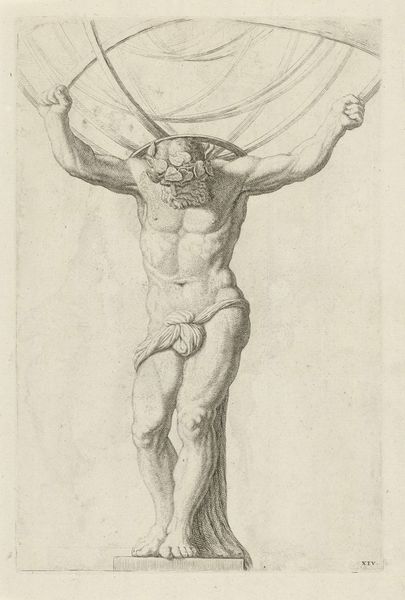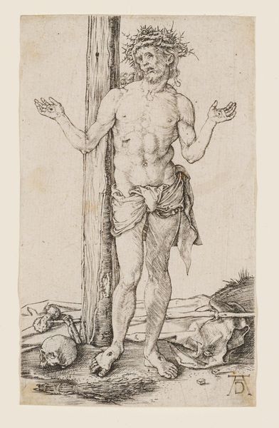 Editor: Here we have Sebastiano Conca's "Christ on the Cross," date unknown, a drawing done with pencil, chalk, and charcoal on paper. There's a certain starkness to it; the muted tones and the focus on the figure highlight the suffering. What stands out to you from a formal perspective? Curator: Immediately, the deliberate use of line seizes my attention. Observe how Conca employs varying line weights and densities to create depth and volume. The figure of Christ is rendered with considerable detail, especially in the musculature, achieved through meticulous hatching and cross-hatching. Editor: I see it now that you point it out - how the hatching really gives the body form. But what about the composition overall? It seems so… straightforward. Curator: Indeed. The composition, while seemingly simple, reveals a sophisticated understanding of spatial relationships. The figure is centrally positioned, drawing the viewer's eye directly to the focal point. However, notice how the subtle asymmetry, like the angle of the head and the drape of the cloth, prevents it from becoming static. The ground is basically empty of distracting detail. What does this emphasis accomplish, do you think? Editor: I guess it throws all the weight onto the figure, and the expression, so that form itself becomes the key to emotion. Thanks, that helps! Curator: Precisely. Considering only what is visible in the art, and focusing on form alone, we are capable of uncovering its expressive potential.