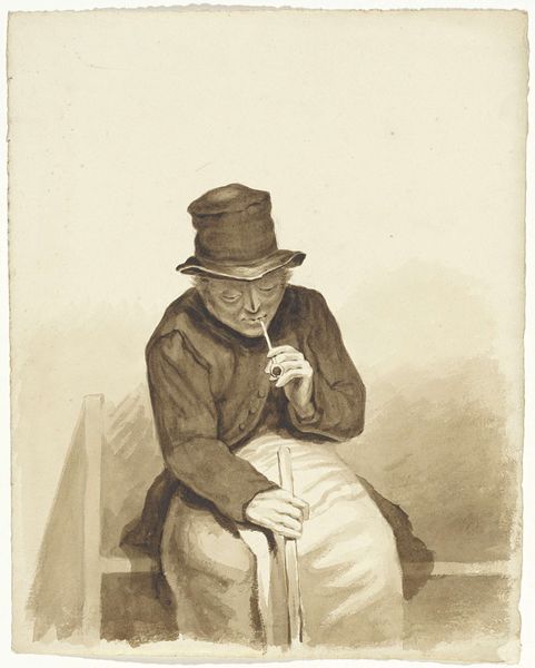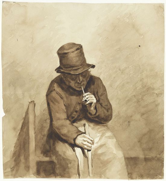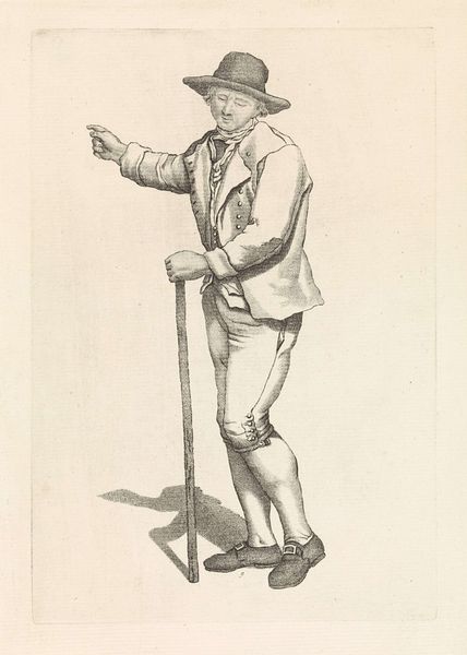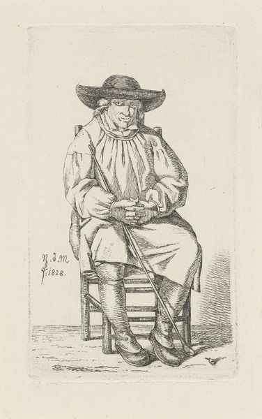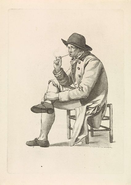 Pieter Kikkert created this print, "Man on a Stool," using etching techniques. Notice the figure's composition: a man seated on a simple stool, arms crossed, gazing directly at the viewer. Kikkert’s use of line is particularly striking. The detailed cross-hatching brings depth and volume, especially in the man's clothing and the textures of his breeches, contrasting with the smooth planes of his face and coat. The structure of the image invites contemplation on representation itself. The man’s gaze, combined with the careful rendering of his posture, may suggest a challenge to established social or artistic norms. The etching's starkness also invites us to consider how an artist might use minimal means to make powerful statements about identity and presence. Ultimately, it is the interplay of line and form that makes this image so intriguing, reminding us that art's meaning is perpetually negotiated through our encounter with it.