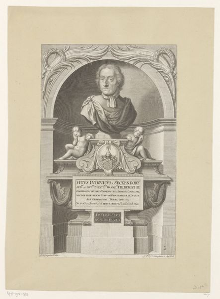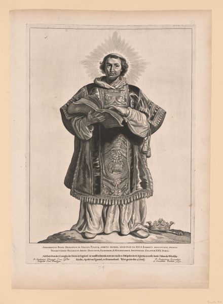 Curator: What a striking figure. Cornelis Visscher’s engraving, "Saint Lebuin, from Saints of the North and South Netherlands," created around 1650. It's currently held in the collection of The Art Institute of Chicago. Editor: My goodness, that halo practically vibrates off the page. It gives the saint this wonderful, slightly mischievous glow. Like he knows a secret. Curator: Perhaps the secret is the incredible detail embedded in his vestments. Visscher truly loaded these ecclesiastical garments with symbolism, didn’t he? Editor: Absolutely. Each figure and motif is so precisely rendered, considering this is an engraving. They narrate stories, probably of Lebuin’s life or the gospels? He carries these, right? One book is quite apparent, another appears to be something less obvious, like a coffer or casket. What's going on there? Curator: It could be a reliquary, which seems plausible. Lebuin, of course, was an English Benedictine monk who helped Christianize the eastern Netherlands. A true evangelist, carrying his faith outward. Editor: His expression feels less fierce and more... thoughtful. You know, sometimes saints get portrayed with that kind of determined, almost severe look. He seems more affable. Almost questioning. Curator: Visscher certainly softens him, providing the faintest smile. Which makes me wonder about his target audience. What sort of emotional or cultural memory was Visscher aiming to awaken? A yearning for simpler times perhaps? Or a call to a faith rooted more in gentleness than force? Editor: Considering the tumultuous religious landscape of the era, with the Dutch Republic emerging from conflict, it's probably a very strategic appeal to commonality rather than division. What I love about iconography is its potential for cultural cohesion. You've just got to get the tone right. Visscher, here, seems to thread that needle expertly. Curator: And what an elegant print that is! It’s funny, you know, you see ‘drawing’ or ‘engraving,’ and you expect something a bit... reserved, perhaps? But this has such an almost startling presence. A lot of visual character, despite the minimal color palette. Editor: I totally agree, an expert way of saying a lot with what would, in other hands, be very little. Well spotted.