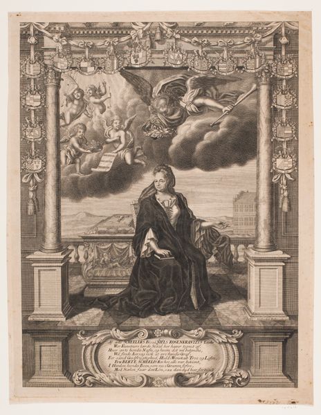 Christian Albrecht Wortmann created this portrait of Christine Elisabeth van Münchhausen using engraving techniques. Consider the era in which Wortmann lived, a time of rigid social structures and gendered expectations, especially within aristocratic circles. This portrait memorializes a woman of status, yet it also employs allegorical figures of death and mourning, reflecting the limited roles and value assigned to women within that society, often defined by their relationships to birth, death, and familial legacy. Wortmann’s choice to include such symbolism speaks volumes about the cultural understanding of women's lives as inherently tied to mortality and remembrance. Notice how the allegorical figures overshadow the central figure, drawing attention to the transience of life and the societal constructs that framed a woman's existence. The elaborate, stylized presentation is deeply entwined with themes of identity, loss, and the complex interplay between personal identity and cultural expectation.