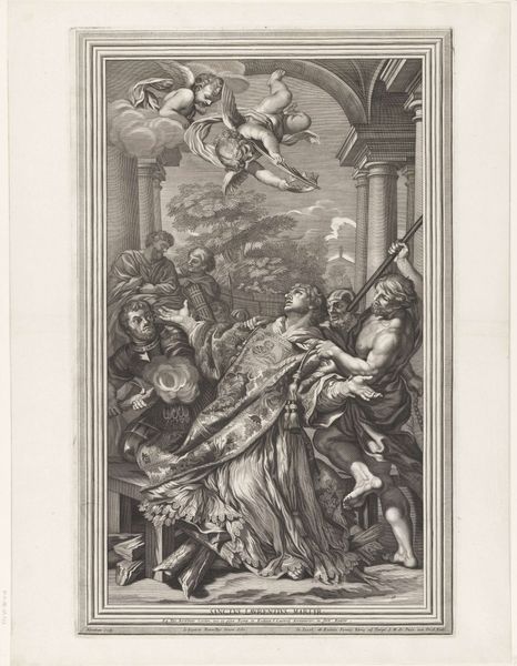 Bernard Picart created this engraving, "Christ Appears to the Personifications of the Continents," sometime between 1696 and 1733. The work visualizes the global aspirations of European Christianity. Seated on a cloud and attended by angels, Jesus floats above figures representing Europe, Asia, Africa, and the Americas. These personifications, identified through symbolic props such as a camel and a lion, direct their gaze upwards toward the Messiah. Picart’s engraving reflects the cultural and political context of its time; the period of colonialism. European powers sought to expand their influence across the globe, often under the guise of spreading Christianity, while, in reality, the expansion was more about commercial interests. Picart's image idealizes this mission, presenting it as a divine encounter that brings diverse peoples under the benevolent authority of Christ. To understand this work better, examine the historical connections between religious institutions and colonial powers. Consider how images like this were used to legitimize European expansion and reflect on the legacies of colonialism.