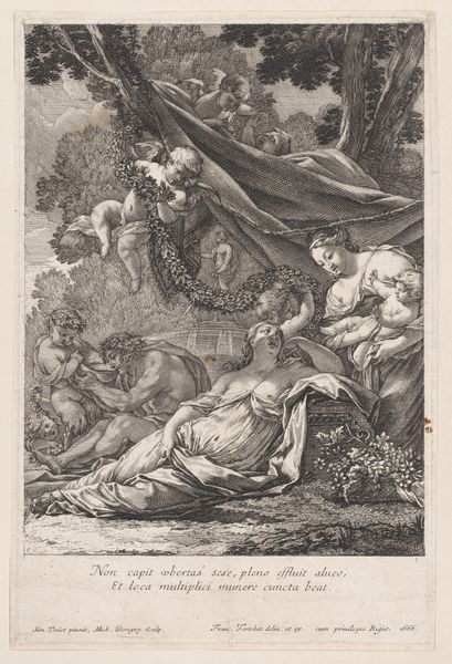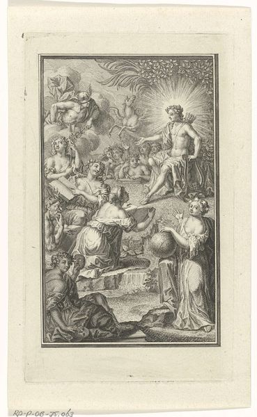 Pieter Tanjé created this engraving, "History of the City of Rome," in the 18th century. The composition is divided into distinct registers, each teeming with allegorical figures and classical allusions. There's a dynamic interplay between the earthly and the divine, achieved through the use of contrasting light and shadow. The upper register features ethereal beings floating amidst clouds, while below, scenes of Roman history unfold. Tanjé masterfully employs line and texture to differentiate these realms, creating a visual hierarchy that guides the viewer's eye through the narrative. This engraving, with its dense symbolism, invites us to reflect on the rise and fall of civilizations and the enduring power of history itself. The artist uses semiotics to interpret the visual components to engage with new ways of thinking about space, perception, power, and representation. Notice how the allegorical figures and classical symbols are not just aesthetic elements but also serve as cultural codes. This work challenges us to consider how art can both preserve and question the stories we tell about ourselves.