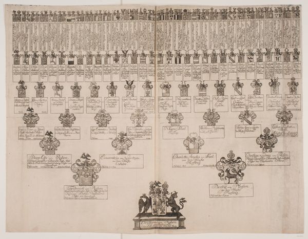 This is "Stamboom van het Huis Nassau, blad F," an undated print by an anonymous artist, now held in the Rijksmuseum. The composition arranges heraldic emblems in a genealogical structure, dominated by the formal linework. Notice how the artist employs a systematic layout of familial descent using interconnecting lines. These lines create a visual hierarchy that marries the artistic with the bureaucratic. Each crest functions as a signifier within a complex semiotic system. The structured format reflects early modern Europe’s obsession with order and classification. It speaks to a broader cultural impulse of organizing knowledge through visual means. The artwork’s aesthetic relies on the interplay between image and text, offering a glimpse into the historical understanding of lineage and power. The careful arrangement and symmetry not only serve an aesthetic purpose but also reinforce notions of stability and inherited authority.