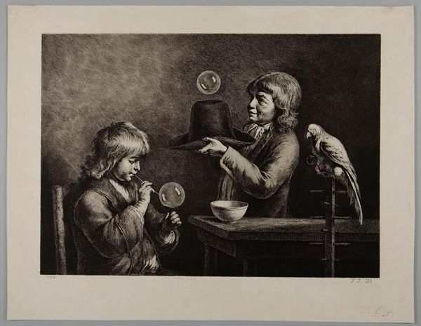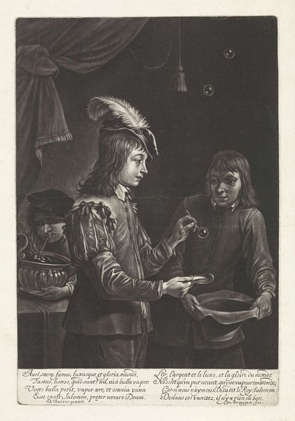 Editor: Here we have Lambert Antoine Claessens' print, "Boys Blowing Bubbles." The ephemeral nature of the bubbles juxtaposed with the formality of the scene gives it a wistful feeling. What do you notice in the composition? Curator: The artist's deliberate use of chiaroscuro directs our gaze to the figure on the left, highlighting the texture of his feathered hat and elaborate costume. Consider also the implied lines connecting the bubble wands to the floating spheres. How do these visual relationships affect your interpretation? Editor: It does create a certain tension, between the boys and the bubbles... as if they’re suspended in time. I never thought about implied lines in that way before. Thanks! Curator: Indeed. The composition invites us to contemplate the interplay between permanence and transience, substance and void.