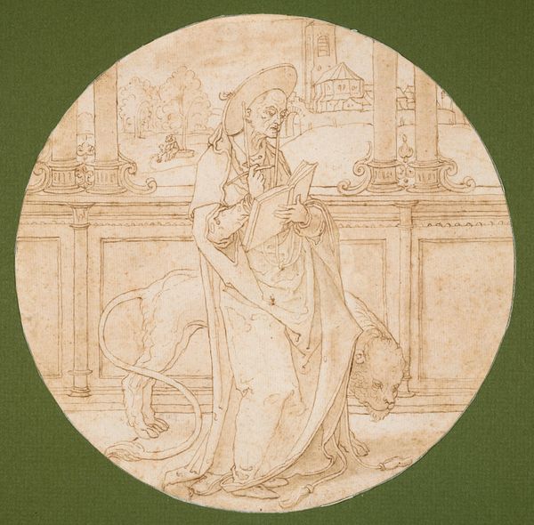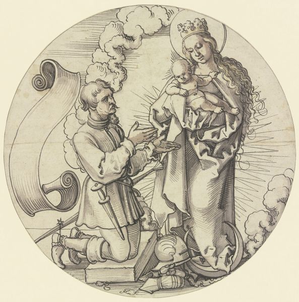 Curator: Well, isn't this an intriguing roundel! Created sometime between 1510 and 1550, this piece, attributed to Georg Pencz, depicts the biblical story of Joseph and Potiphar's wife. It’s rendered in ink on, likely, laid paper, creating a print or drawing intended for wider circulation. Editor: The immediacy is striking. My eye is drawn to the dramatic gesture of Potiphar's wife and the stark contrast between her partially draped figure and Joseph's hasty departure. It conveys a potent moment of accusation and escape. Curator: Exactly! Pencz uses the visual language of the Italian Renaissance, particularly its obsession with classical antiquity and idealised forms, to stage this biblical drama. Note how the architecture in the background adds a layer of classical dignity to the scene. Editor: The symbol of the fleeing Joseph… he's a fascinating representation of resistance to temptation. His closed fist is quite unusual, which contrasts heavily with the wife's pose. But consider, isn't it curious how frequently the 'temptress' figure recurs, often vilified, across cultures? Does it serve to displace male desire onto the female form? Curator: Indeed. And you touch upon a key point – how this imagery functions within the patriarchal structures of the time. This depiction also touches upon power, desire and accusation within the social contexts of 16th century Europe, where artists grappled with both classical ideals and religious narratives. The act of circulating this print then serves a moralising function, embedding certain ideas about virtue, gender and power into the wider populace. Editor: You’re right; the act of distribution itself becomes part of the artwork's message and its cultural influence. The architecture visible through the window and door must have had symbolism relevant to the time, as well. Curator: This adds a depth, encouraging us to look at how narratives like this participate in a bigger conversation within art and wider society, influencing perceptions and societal values, just as it has done since. Editor: The exploration of these classical themes adds so much depth to understanding social constructs related to morality that are timeless, as represented by art.