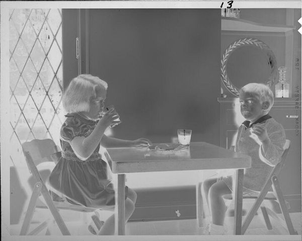 Curator: This work, simply titled "Untitled (woman and baby looking into mirror)," is by Lucian and Mary Brown. Its dimensions are approximately 10 by 13 centimeters. Editor: Oh, what a sweet, quiet moment! The woman, holding the baby, looks into the mirror with such tenderness. Curator: The image really speaks to the construction of identity, doesn't it? How we understand ourselves through reflection and familial bonds. Editor: Absolutely. It's like the mirror shows them not just their reflection, but also their connection, their shared history. Curator: And it makes me consider the role of the domestic space in shaping those identities, particularly for women. Editor: I love the little details, too—a tiny bird on the dresser. It brings a touch of whimsy. Curator: It really invites us to think about these everyday moments and the profound ways they mold us. Editor: Exactly! A gentle reminder to cherish those small, mirrored glimpses of love and growth.