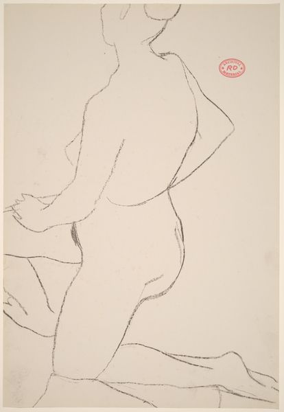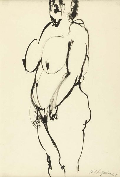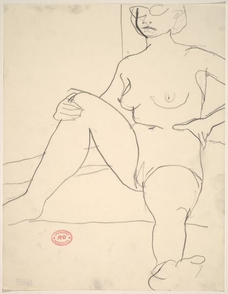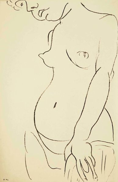 Curator: The piece before us, an ink drawing entitled "Thinking" by Ligia Macovei, immediately strikes me with its apparent simplicity, its embrace of line as the primary vehicle of expression. Editor: It's stark, isn't it? The single line drawing, no shading to hide behind... Makes the whole posture of contemplation really pop. It’s as if she’s been captured in a silent film – all feeling, no frills. What’s she pondering, do you suppose? Curator: It's that very openness to interpretation that invites reflection. The reclining nude figure is a classic pose, of course, steeped in art historical precedent, invoking Venus and countless others, but Macovei's use of minimal, almost naive lines adds an interesting modern edge. The absence of embellishment urges us to engage directly with the woman's psychological space, doesn't it? Editor: Absolutely. There's something very immediate, even raw, about it. The lines feel… vulnerable. The subject’s gesture of holding her face could speak of doubt or uncertainty; hands are symbolic, often communicating subconscious gestures. Perhaps the artist is asking the viewer to consider her inner struggles too? Curator: Indeed. Consider how line has, over millennia, served as the foundational act of visual language itself. The use of ink reinforces this—a medium historically associated with thought, documentation, and intimate expression. The single line creates both form and meaning, the exteriority and interiority of her figure, the outward facing body and her concealed, yet evocative inner world. Editor: Funny how something so basic can speak volumes, isn't it? Looking at the face now... There’s a weariness there. It brings to mind a sense of ennui. Almost feels voyeuristic catching her like this – lost in thought, completely unvarnished. Curator: And consider how she presents a direct yet unidealized representation of the female form. In doing so, is the artwork reclaiming historical representations or making a personal statement about subjective perception and how to think through and reconcile reality? Editor: Perhaps both! In the end, though, “Thinking” ends up feeling like a delicate, almost fragile snapshot of the human condition. It leaves a quietly lasting impression. Curator: Precisely. Thank you for sharing your thoughts! A potent image, certainly, prompting ongoing considerations around subjectivity, vulnerability, and visual memory.