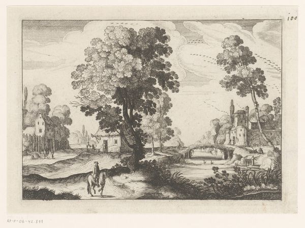 Editor: We are looking at *Landscape with Ruins* from sometime between 1700 and 1730, an etching and engraving by Monogrammist MEG. The scene is quite detailed with figures and buildings, and feels very serene despite the ruinous structures. What strikes you about this piece? Curator: Primarily, I observe the artist's masterful manipulation of line and tone. Notice how the density and direction of the etched lines define form and create depth. The foreground exhibits darker, more concentrated lines, progressively lightening as our eyes move toward the background. This aerial perspective is cleverly achieved through purely formal means, establishing a clear recession into space. Editor: It’s interesting how much depth they achieve with just lines. How does the composition contribute? Curator: The composition is classically structured. The ruin on the right anchors the visual field, balanced by the suggestion of distant mountains on the left. The figures serve a dual purpose, providing scale and leading the eye deeper into the landscape. Observe, too, how the placement of the trees and clouds follows a similar pattern of controlled asymmetry, generating a harmonious and balanced whole. Is there any element that particularly grabs your attention? Editor: I hadn't really considered how deliberate the asymmetry was. I suppose the ruin drew my eye most strongly, because it has such complex shapes. Curator: Indeed. Now, contemplate the use of light and shadow – or, more precisely, the carefully orchestrated interplay of hatched and unhatched lines that approximate light and shadow. Consider the stark contrasts near the ruins versus the more muted transitions in the distance. This not only creates visual interest, but contributes to the overall spatial illusion. Editor: I see what you mean. Paying attention to the formal qualities has definitely deepened my understanding of how the image works as a whole. Curator: Precisely. Formal analysis reveals the intrinsic mechanisms through which the artist conveys meaning, irrespective of historical or cultural contexts. It’s a language of form, line, and light that speaks for itself.