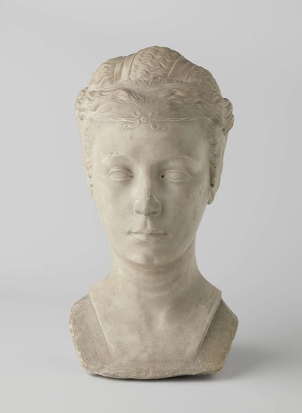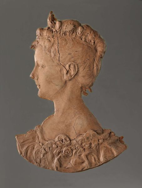 Editor: This is Auguste Rodin's "Bust of a Young Girl," created in 1868. It's made of terracotta. I'm struck by the girl's gaze; there's a hint of melancholy there. What captures your attention when you look at this sculpture? Curator: It whispers secrets, doesn't it? For me, it's Rodin's incredible ability to breathe life into clay. He captures a fleeting moment, an internal world made visible. Think of his later, more famous works. You can already see hints of that roughness, that interest in capturing emotion, not just replicating form. She’s not just a girl; she’s an idea of youth, perhaps even innocence slipping away. Editor: The unfinished quality of the sculpture is interesting. It seems to contrast with the smoothness of her face. Curator: Absolutely. Rodin’s touch is so present. You can almost feel his hands working the clay. This wasn't just about replicating reality; it was about imbuing it with feeling. The rough texture works almost like impasto in painting. Notice the unfinished areas around the bust, as if she's emerging from the earth, or perhaps fading back into it. What does it suggest to you? Editor: That idea of emerging and fading resonates. It adds another layer of vulnerability. It’s like she’s caught between two worlds. I see a powerful use of light. It is reflecting on the smooth skin, making it more intense than the texture of the rest of the sculpture. Curator: Precisely! You’re picking up on the push and pull, the tension between light and shadow, finished and unfinished. It is the essence of life that Rodin masterfully captures. Every angle presents a different story, a fresh perspective on this fleeting moment. Editor: It's incredible how much emotion is conveyed through something as simple as a clay bust. I'm left wondering what the rest of her story is, imagining her just beyond the frame of the sculpture. Curator: Exactly! The questions it stirs within us – that's the magic of art, isn’t it? Thank you, I hadn't fully realised that fading and emerging metaphor before!