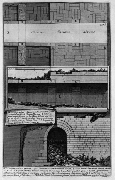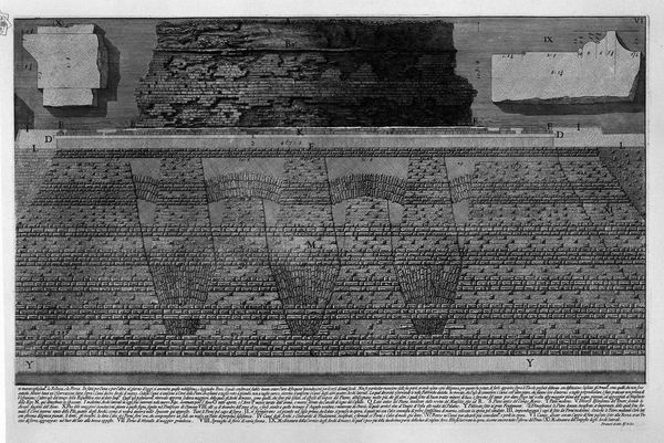 Curator: Here we have "The Roman Antiquities, t. 2, Plate V," an etching by Giovanni Battista Piranesi, dating back to 1756. Editor: My immediate reaction is... weight. The sheer mass of those stones, even depicted in monochrome, feels palpable. You can almost feel the coolness radiating from the ancient rock. Curator: Absolutely. Piranesi was a master of conveying the monumentality of Roman architecture. He wasn't just documenting ruins; he was interpreting their grandeur and, some would say, even exaggerating their scale to emphasize the empire's past power. He's essentially making the stones speak. Editor: And look at the precision of the lines! The detail is incredible. Each stone seems to have its own story etched onto its surface, its own unique texture revealed through these intricate lines. You almost forget it's just ink on paper. Curator: Piranesi was incredibly skilled. This print comes from his series "Le Antichità Romane," a comprehensive visual survey of Rome's ancient structures. Through these detailed studies, he sought to recreate and share his romantic vision, sometimes with imagined elements, which later informed archaeological reconstruction. Editor: There is this tension between ruin and monument... Even in decay, the architecture holds its imposing dignity. In truth it captures an aesthetic that would linger on within art for ages after. It has a melancholy to it, right? As though all greatness must one day pass into decline. Curator: Exactly! Piranesi tapped into the zeitgeist of his time. The rise of the Grand Tour increased public interest in Roman antiquities. Piranesi was savvy and created these views to feed the market, becoming quite successful, by creating highly graphic visions of what was thought of a powerful past. Editor: It is that drama, and depth that makes it linger in the mind. The way the light falls, the textures of the stones, makes us contemplate more than architectural documentation. More that stone. Something eternal and somber. Curator: In a way, Piranesi’s legacy goes beyond just historical accuracy. It's about how images of power circulate, evolve, and shape our understanding of the past, regardless of what is there today. It brings the ruins alive. Editor: And, perhaps, a timely reminder that even the mightiest structures are, in the end, just stones—albeit extraordinarily impressive and meticulously rendered ones. Curator: Well said. A visual reminder of history and time's passage, etched in black and white for eternity.