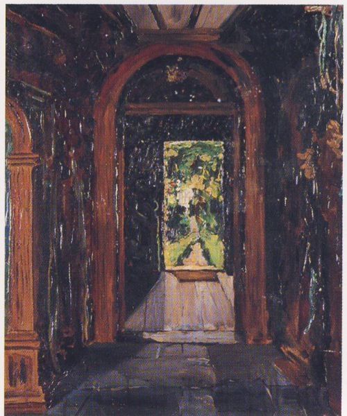 Vasily Polenov created this watercolor drawing, titled "Chronicle of our artistic circle. Drawing for the cover," probably in Russia in the late 19th or early 20th century. It shows the interior of a grand house. We see a staircase leading up to a doorway that frames a view of a garden, complete with a classical sculpture. This is a carefully constructed image of cultured life, a world of refined aesthetic taste. The title suggests that this drawing was made for a specific purpose, perhaps to document or celebrate a particular group of artists. We can learn more about this social context through archival research. Letters, diaries, and exhibition catalogs can tell us about the artistic circles of Polenov's time. These sources help historians understand the social conditions that shaped artistic production and, ultimately, the public role of art.