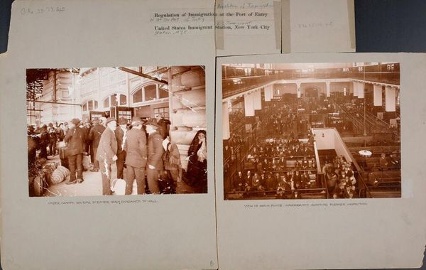 Editor: This mounted photograph by J.H. Adams shows the United States Immigrant Station in New York City. The sepia tone and the large groups of people create a sense of overwhelming activity. How do you interpret this work? Curator: This image encapsulates the complexities of the immigrant experience. It invites us to consider questions of power, regulation, and the human cost of immigration policies. The photograph's composition highlights the stark contrast between those seemingly processed and those still waiting, prompting reflection on the concept of belonging. Editor: So, it’s about more than just a historical record? Curator: Absolutely. It serves as a potent reminder of historical injustices and ongoing struggles surrounding immigration and the search for a better life. It can encourage a more compassionate dialogue around these issues. Editor: That gives me a lot to think about. Thanks!