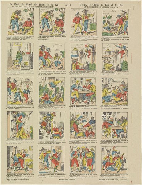 Editor: Here we have "De gelaarsde kat / Le chat botté," or "Puss in Boots," a print dating from 1833 to 1911, attributed to Brepols & Dierckx zoon and housed in the Rijksmuseum. It is laid out like a comic strip. It has an innocent, storybook feel, though I’m curious how we should read these panels sequentially. What do you see in this work? Curator: Observe how the artist uses line. The clarity and consistency of the ink work define each scene, dividing the composition into these ordered compartments. Each panel gains its own distinct character through slight alterations in line weight and hatching, directing the eye in specific ways. Notice the varied approaches to shading, lending depth. Editor: I see what you mean. Each panel almost operates as an individual composition despite forming one unit. How do you think the artist intended us to engage with the comic strip's composition as a whole? Curator: Consider the distribution of color. The repetition of reds and yellows creates visual rhymes between different narrative moments, while the varying intensity and placement generates a pleasing optical rhythm. Note the starkness of certain outlines and blocks of color—where the artist deviates from this, does it denote a shift in meaning? Editor: That’s fascinating! Thinking about it structurally helps decode how the images are arranged. Curator: Exactly. And do the different perspectives chosen in each panel create a sense of movement? What does it suggest that we are not dealing with a traditional sense of linear perspective, as in Renaissance painting? Editor: I suppose it pulls you back from any illusionistic space and emphasizes the surface, underscoring that these are separate panels rather than scenes from real life. Curator: Precisely. It reinforces the flatness, highlighting its inherent qualities as an object to be analyzed. This was insightful, how do you see it now? Editor: Now, examining the arrangement of color, line, and form helps me view the panels both individually as structured images, and holistically, as one print. Thank you.