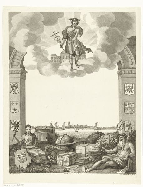 Bernard Picart created this print, "Two Angels with a Coat of Arms Above a City," using etching and engraving, likely in the early 18th century. These methods involve using acid to bite lines into a metal plate, which is then inked and printed onto paper. The material qualities of the print – its line, tone, and texture – all depend on Picart’s mastery of these techniques. Look closely and you can appreciate the precision required to create this image. The etcher and engraver wielded sharp tools to define every detail, from the angels' delicate wings to the architectural details of the city below. In Picart’s time, printmaking was both an art and a trade, requiring skilled labor and specialized knowledge. These prints, sold in multiples, served to disseminate images and ideas widely. This artwork gives us a glimpse into the material processes and social context that shaped the production and consumption of images in the early modern world. It reminds us that even seemingly simple prints are the result of skilled making.