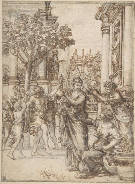 Curator: Welcome. We are looking at "Apparition of Christ" by Parmigianino, likely created between 1524 and 1527. What strikes you first? Editor: The energy, undeniably. A raw, frenetic quality in the marks. It's quite gestural, as if capturing a fleeting moment of intense action. Curator: Indeed. The artist was a key figure in Mannerism, and here you see that interest in dynamic compositions, figures in exaggerated poses, all designed to heighten drama and emotional impact, which aligns with the socio-political unrest of the Italian Renaissance period. Editor: And all executed on paper with pen and brown ink! I’m thinking about the accessibility of that medium. This wasn't some grand commission carved in marble. It's immediate, and that quick execution seems intrinsic to the subject. Curator: Absolutely, this would likely be a preparatory drawing; it shows how artists would develop and plan out the compositions. I am curious how he engages the viewers. How does his art affect society? Does the content itself deliver an empowering message for the current society? Editor: I see your point. The figure of Christ feels separate from the human crowd – look at how Parmigianino positions the Messiah towering atop the crowd, creating a sense of removal but also dominance, contrasting the divine with our mortal coil, the artist has truly demonstrated his ability to merge philosophy with visual form. I am also impressed by the economical use of materials to achieve so much expression. Curator: And yet, it is important to remember these drawings were made with specific intentions—meant to realize artworks accessible to those elite patrons commissioning religious works that validated their beliefs, or who may not have the intellectual and religious foundation of the topic itself. Editor: That makes me ponder about who gets access to this kind of powerful image today. Now on display in the Metropolitan Museum of Art, New York, how is the meaning further shifted by this context? Curator: Indeed, museums play a key role in mediating our relationship with art. This piece reminds me of the artist’s vision within historical and social constructs. Editor: And I'm left appreciating how Parmigianino combined humble materials with remarkable skill to convey such potent dynamism and feeling.