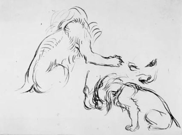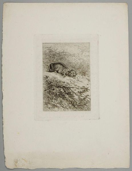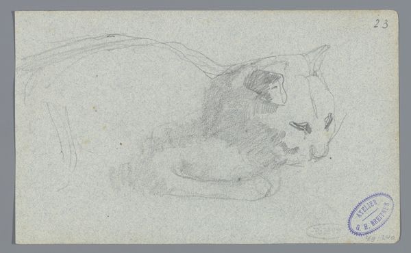 Curator: This pencil drawing, "Cat on the Alert (A Book of Cats)," is by Tsuguharu Foujita. It's an intriguing depiction, offering a glimpse into the artist's exploration of feline form. Editor: The grayscale gives it a sort of vintage or timeless feel, and the composition is just beautiful. It’s incredible how the cat's curled-up pose creates this tight, self-contained form against the soft, blended background. It's quite restful. Curator: Foujita often depicted cats. One could suggest these portrayals reflect societal shifts towards increased domesticity and perhaps even changing attitudes towards animals within early 20th-century urban environments. His rendering certainly capitalizes on the animal's inherent appeal to charm its audience. Editor: The textures he manages to achieve with simple graphite on paper are remarkable. Look at how the fur seems almost tactile, contrasting with the smoother gradient surrounding the subject. He evokes form so wonderfully! It creates depth and directs our focus straight to the slumbering animal. Curator: Interestingly, despite the artwork’s title, the cat appears quite at ease. This tension invites reflection upon ideas surrounding animal sentience. Editor: Absolutely, I think you get that slight irony there. I'm fascinated by the delicate details within a limited tonal range, a perfect demonstration of the artist’s capacity for close observation. It has an immediacy. Curator: His work invites interpretation in light of Japan’s fascination with Western art during the period, a dialogue, or cultural exchange made explicit. The blending is suggestive of painting methods like sfumato. Editor: I think this piece really speaks to how something as simple as a cat can convey such stillness. Curator: Indeed. It’s a compelling insight into evolving artistic approaches to everyday life. Editor: Well, it gives us an interesting technical and contemplative encounter with the image.