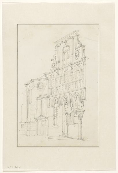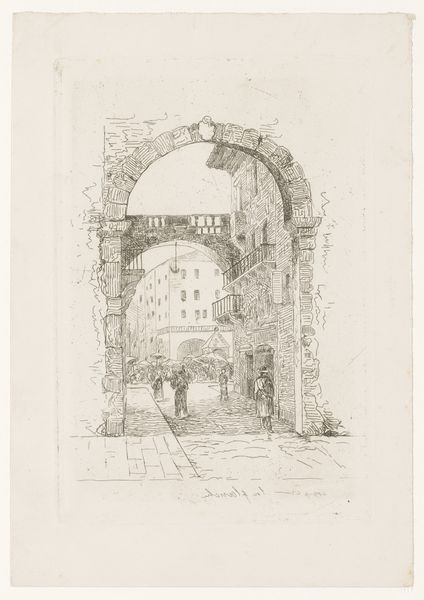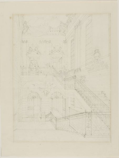 Editor: This is “Fængselsgård i Palazzo del Bargello” or “Prison Courtyard in Palazzo del Bargello” created in 1819 by G.F. Hetsch using pencil and etching. I find it striking how precise and almost sterile the courtyard appears, despite knowing it's a prison. How should we interpret this depiction of confinement? Curator: It's crucial to remember that representations of spaces, especially those of authority like prisons, aren't neutral. Consider the political climate in Europe during the early 19th century. Neoclassicism, the artistic style prominent here, often served as a visual language of order, reason, and civic virtue. How might this choice of style influence our perception of the prison? Editor: It almost makes it look… respectable? I suppose the clean lines and order would suggest justice and control rather than brutality. Curator: Precisely. Think about who would have commissioned or viewed such an image. The drawing could be used to legitimize power by presenting imprisonment as rational and architecturally sound. It’s not simply a drawing; it's a carefully constructed piece of visual propaganda. Editor: So the artist isn't just showing us a prison; they're subtly telling us something about the prevailing attitude towards justice and authority? Curator: Exactly. By depicting the prison courtyard in this way, the artist participates in the discourse surrounding punishment and power. The image helps perpetuate certain social and political values of the time. Editor: I never considered the role art plays in reinforcing societal structures. It’s fascinating to see how even seemingly objective architectural drawings can carry such powerful ideological weight. Curator: It challenges the idea that art is just about aesthetics. The power of images lies in their ability to shape how we see and understand the world. We can't simply appreciate art for its technique.